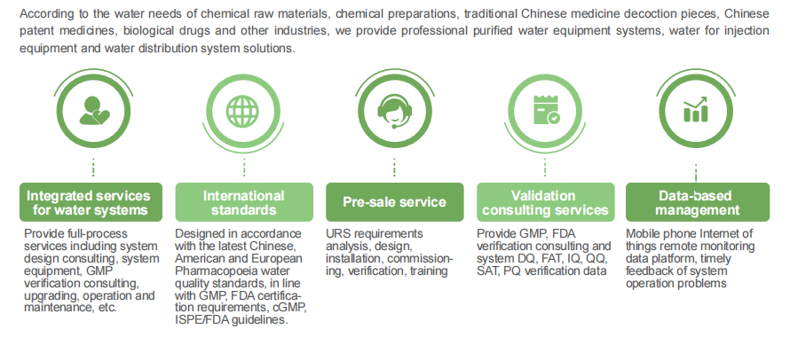 Qiqin provides complete water treatment solution for bio-pharmaceuticals. Purified water system follows modular design concept, based on functional units such as pretreatment, oxidation disinfection, multimedia filtration, reverse osmosis, UV disinfection, EDI continuous deionization, water storage and distribution. Advanced technology, exquisite craftsmanship, and strict quality control are implemented in design, manufacturing, and commissioning processes for each functional unit. The purified water system is optimally combined from various functional modules according to different water usage standards, thereby ensuring high performance and quality of the entire system, making the produced water fully meet or exceed quality standards for purified water and water for injection, so that meeting the requirements of preparing purified water or distilled water for pharmaceutical factories, hospitals, and laboratory diagnostic reagents.